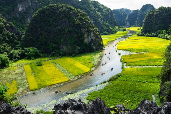 Por la mañana, después del desayuno en el hotel, tomarán la ruta de Hanoi a Ninh Binh que se encuentra 100 km al sur de Hanoi. Llegamos a Hoa Lu visitaremos dos templos de las dinastías Dinh y Le. Por la tarde realizaremos un crucero en sampán a través de un paisaje fantástico a lo largo del Río Ngo Dong en Tam Coc (tres grutas) llamado también “Bahía de Halong seca” o “Bahía de Halong entre los arrozales”, un paisaje impresionante lleno de rocas, cuevas y arrozales. Regreso a Hanoi. Noche en el hotel.